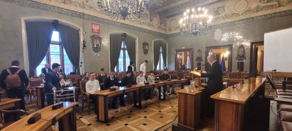 3 grudnia 2025 r. klasa 2gos udała się do Pałacu Wielopolskich na Plac Wszystkich Świętych. Uczniowie spotkali się z Radnymi Miasta Krakowa: Aleksandrą Owcą, Maciejem Michałowskim oraz Rafałem Nowakiem. Poznali historię Pałacu Wielopolskich oraz obserwowali sesję Rady Miasta Krakowa.